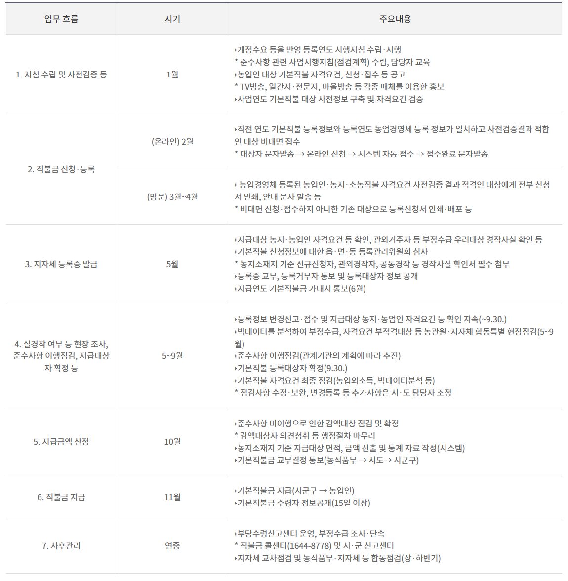 * 소농직불금: 일정 요건(개인 경작면적, 농가 소유면적, 영농 종사기간, 농촌 거주기간, 농외소득 등)을 모두 충족하는 농가에게 면적에 관계없이 120만원 지급